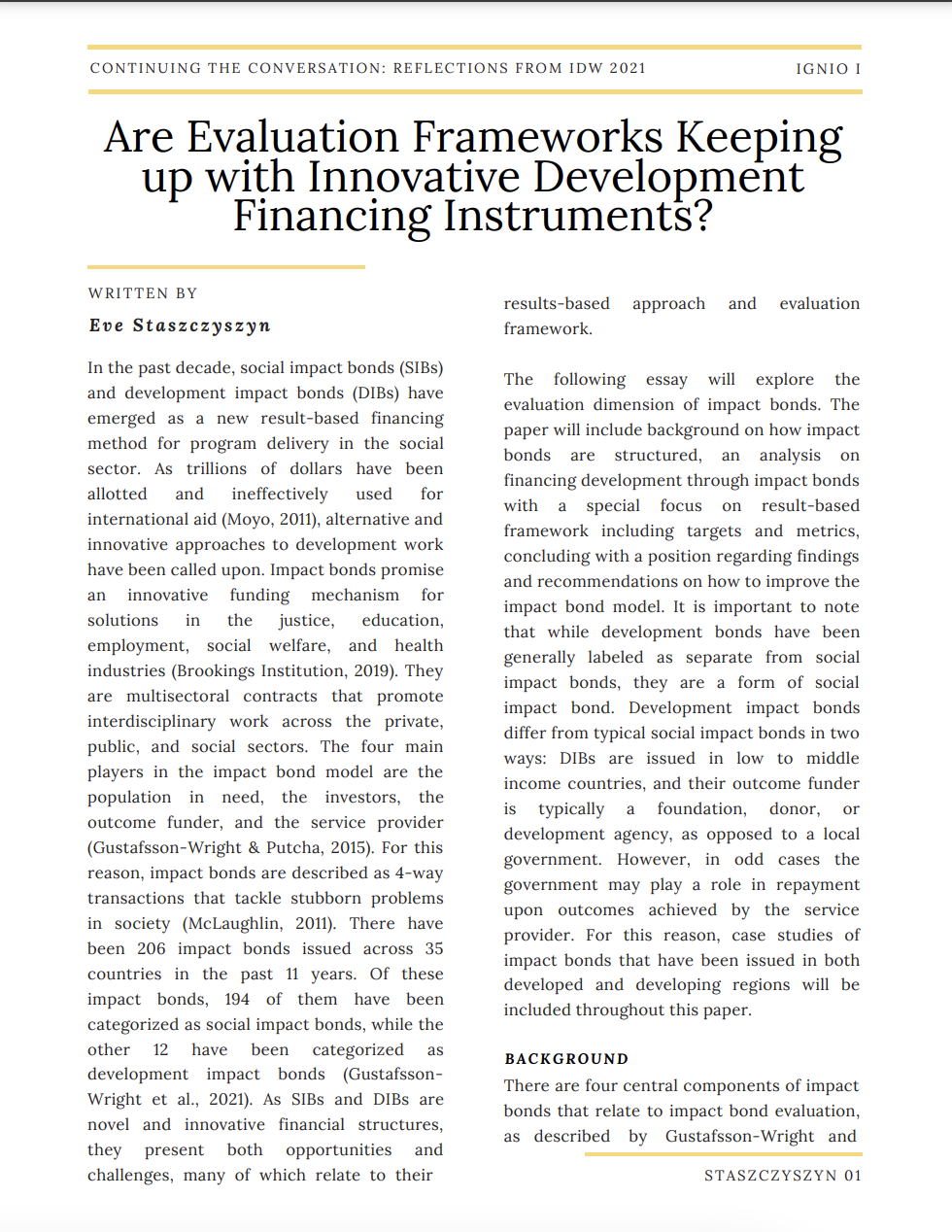 As social impact bonds and development impact bonds welcome an opportunity for private sector investment to provide capital for social change, community interest must be prioritized in these multi sectoral contracts. Evaluation frameworks must ensure that targets and desired outcomes align profoundly with communities that impact bonds are set up to serve. Innovation is needed to combat the inefficiencies and ineffectiveness currently faced in traditional development aid, and with community-driven evaluation frameworks, impact bonds have the potential to transform the mechanism of today’s traditional aid programs.