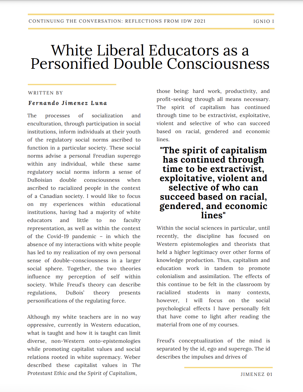 Through personal academic experience, I argue that the white educator visually embodies my own ‘personified’ Duboisian double consciousness. This develops through agents of socialization and the social behavioural inclinations held within the Freudian superego that teach values such as discipline, kindness, etc. I also argue this white embodiment of values and values themselves are an extension of Weber’s description of capitalist values. While educators have taught with care, this liberal ideology does not support racial liberation. The pedagogical practices of increased representation of racialized students and cultural integration may ameliorate the issue of racial disassociation with the values taught in Canadian schools.